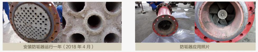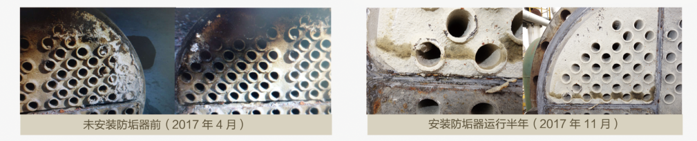 现场未安装防垢器前,塔**气冷却器每运行半年因管束内壁结垢严重,冷却效率下降,需要停产检修,拆卸管束并用高压水冲洗,严重情况个别管束内部被完全堵塞,降低流量,压力损失增加。